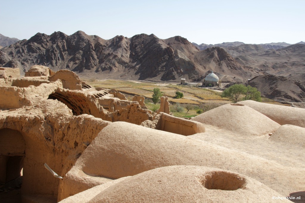 De volgende dag maken we een tripje via het hostel. Samen met een jongen uit Slovenië op pad. We gaan langs drie bezienswaardigheden in de omgeving; Karaghnagh, Chak Chak en Meybod. We rijden met wederom zo’n klein wagentje van lokale makelij. Het is ongeveer een uur rijden naar Karaghnagh. De omgeving wordt steeds fraaier. Eerst vlak, maar al snel meer bergachtig met rotsen in prachtige kleuren. Karaghagh is ook een lemen dorpje maar dan nog geheel in de originele, vervallen staat. Het ligt prachtig aan de rand van een vallei. Het zijn allemaal kamers en gangen op elkaar gebouwd. Echt een enorm doolhof waar je op heel veel plekken naar boven kan klimmen om op de daken van het uitzicht te genieten. Ontzettend fraaie plek, veel authentieker dan het centrum van Yazd. Stop nummer twee is Chak Chak, dit ligt echt midden in de bergen in de woestijn. Het is niet meer dan een paar gebouwen hoog tegen een bergwand. Maar dit is een erg heilige plek voor de Iraniërs. De gebouwen zijn gemaakt rondom een plek waar water uit de rotswand druppelt. Een uniek iets in deze omgeving. Daardoor is een heel kleine oase ontstaan met wat bomen. En volgens het verhaal heeft een herder hier een visioen gehad dat hij een gebouw moest plaatsen op deze plek. En daaruit is de heilige plek ontstaan. Het is een aardige klim op de trappen omhoog in de hete zon.