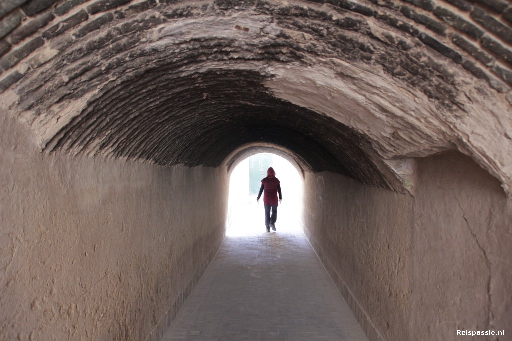 De volgende dag een rondje door het oude centrum gedaan. De gebouwen en huizen zijn hier gemaakt van leem en het is er een doolhof van steegjes. De huizen werden hier vroegen voorzien van een windtoren die op een ingenieuze manier de wind opving en koelere lucht naar binnen transporteerde en de warmere lucht van binnen naar buiten leidde. Er zijn nog een heleboel huizen voorzien van deze torens. Als we een hoog gebouw midden in de oude wijk opgaan heb je een prachtig uitzicht op de gelige lemen daken met her en der de windtorens die boven de rest uitsteken. De kleurige blauwe koepels en minaretten van de moskee steken hier weer mooi bij af. Fraai plaatje. We drinken heerlijke koffie bij een van de vele koffietentjes die in dit deel zitten. Vervolgens langs wat fraaie moskeeën en een traditioneel huis. Die middag een hele lange lunch genomen bij het Silk Road hotel. Als we er neerploffen op een van de royale traditionele ligbanken met kussens horen we dat ze hier ook een buffet hebben. En dat blijkt een hele goeie deal te zijn. Heerlijk gegeten. En dan lekker lang blijven hangen op de bank. Het is buiten toch het heetst van de dag en hier op de binnenplaats is het heerlijk vertoeven.