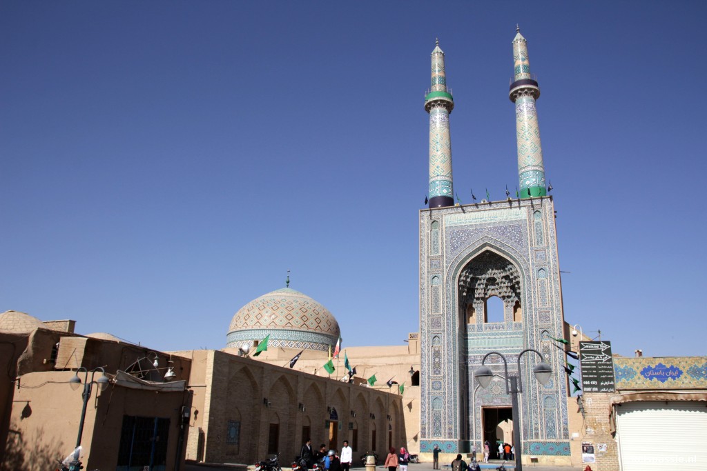 Het enige minpuntje is dat onze bus naar Yazd pas na een uurtje komt opdagen en we dus wat later vertrekken. Zodra we Shiraz verlaten rijden we weer de woestijn in. Soms vlak, soms bergachtig, vaak met prachtige vergezichten, en vooral dor en onherbergzaam. Hoe moet dat honderden jaren geleden geweest zijn dagenlang door die enorme hitte. Want ondanks dat we nu al in het ‘koelere’ seizoen zitten is het toch behoorlijk heet. Dik boven de 30 graden, maar dat schijnt nog niets te zijn vergeleken met de zomermaanden want dan wordt het hier echt heet.
