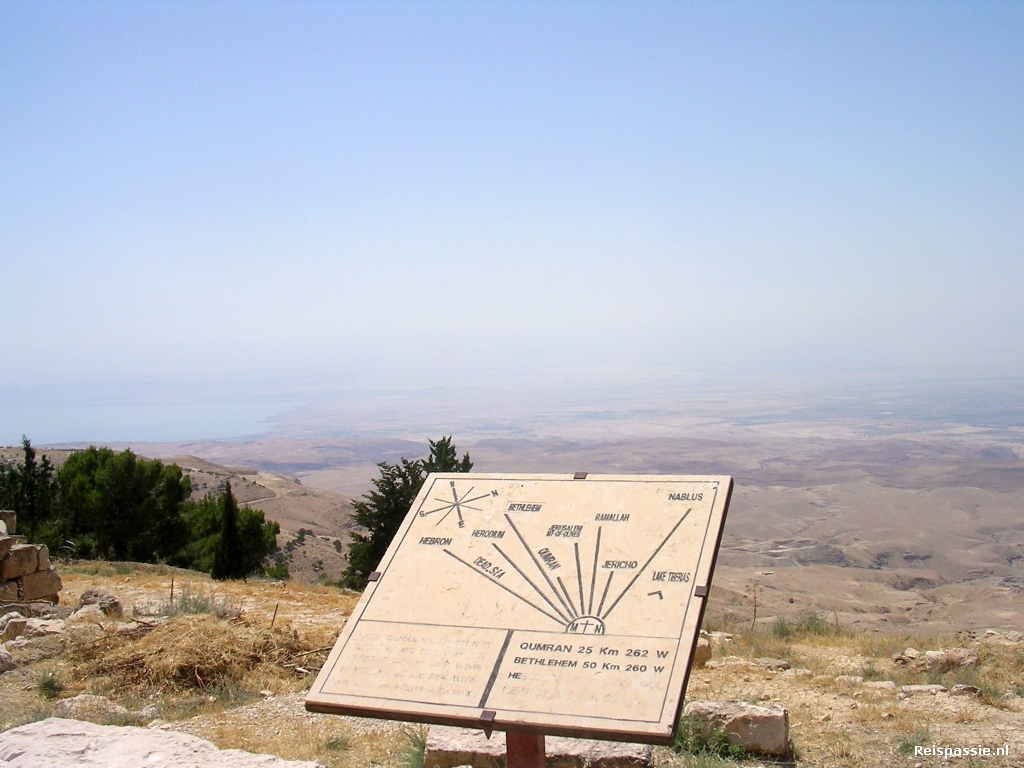 Het uitzicht is prachtig; de Dode zee met de Jordan rivier die de scheiding vormt tussen Jordanie en Israël. In de verte zijn net nog de contouren van Jericho te zien.