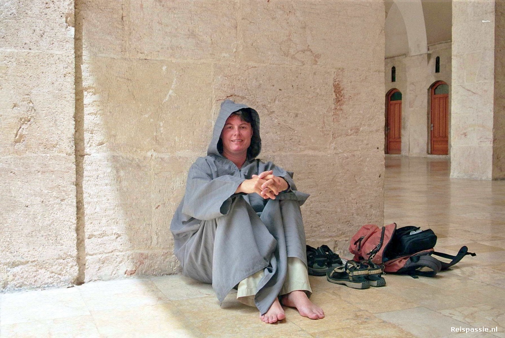 Door de wirwar van straatjes onze weg naar de souk van Aleppo gevonden. Deze overdekte marktstraatjes beslaan hier maar liefst meer dan zeven kilometer! Hele stukken zijn nog de originele stenen gewelven waar het licht door kleine ventilatiegaten naar binnen schijnt. Het geeft een fraai mysterieus effect. En ook hier is echt alles weer te koop. Halverwege staat de grote Ummayad moskee, je loopt zo van de souk naar binnen. Dat wil zeggen, als man dan want Anita moet eerst de kleding aanpassen. Een heel elegante overjurk die alles bedekt wordt aangereikt. Het is net een kabouter van de Ku-klux klan... De moskee is aardig druk bezocht ondanks dat er op dit moment geen gebedsdienst is. Veel families liggen in de schaduw van de galerij snacks te eten terwijl de kids over de binnenplaats rennen. Heel relaxed gebeuren. We vleien ons ook neer tegen een pilaar en laten het hele gebeuren aan ons voorbij trekken. Meteen komen mensen handen vol popcorn brengen en zitten we gezellig aan.