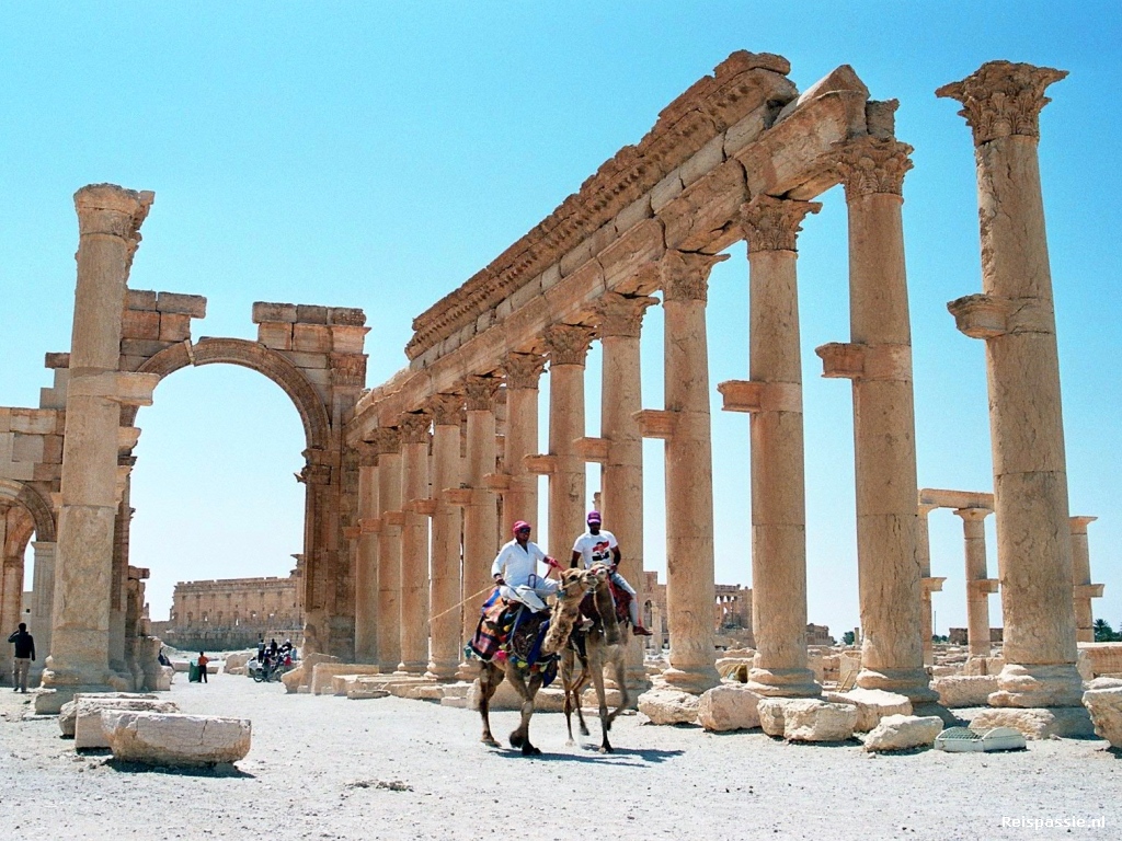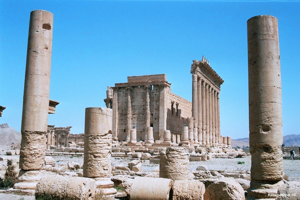 Het waait nog steeds hard maar het stof is verdwenen en de zon staat weer helder aan de hemel. Ali stapt achter het stuur van het busje van de familie en we gaan richting de graven. In de heuvels achter de ruine's van Palmyra staan her en der van deze graven. Het zijn vierkante torens van een verdieping of vier. Binnen is nog wat terug te zien van de vroegere inrichting maar verder zijn ze vrij kaal. We laten ons afzetten bij de ruine's van Palmyra en gaan eerst naar de tempel van Bel. Dit is het best bewaard gebleven monument en was vroeger het religieuze centrum van de stad.