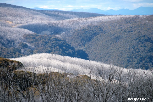 Dan gaan we weer de bergen in, de Australische Alpen! Als eerste naar Mt.Buffalo een hooggelegen nationaal park. Echt een heel fraai park. Er hangt een zilveren gloed over de heuvels van alle kale boomstammen die als prikkertjes uit het groen omhoog steken. Ook hier hebben ze een jaar of wat geleden (enorme) bosbranden gehad en alle bomen zijn doodgegaan door de hitte. Vreemd genoeg zijn ze niet zwartgeblakerd, maar heeft het hout een zilverachtige kleur. Gelukkig groeit het al weer enorm en ziet het ook al weer “gewoon” groen.