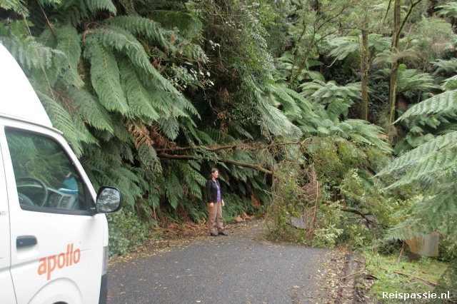 Als we de weg terug naar de kust vervolgen is deze na een kwartiertje rijden verspert door een omgevallen boom. Niet een enorme maar groot genoeg om de boel te blokkeren. En echt niet even om te trekken. Gewone personenauto's kunnen er net onderdoor rijden maar ons bussie is een metertje te hoog. Dus in z'n achteruit de helling met de haarspeldbochten weer op. Het is een smal weggetje. Gelukkig is er snel een uitzichtpunt bij een waterval waar valt te keren en kunnen we terug rijden via de weg die we heen ook genomen hebben. Het is maar 80 kilometer omrijden. Maar ach, we kijken hier niet op een kilometertje.