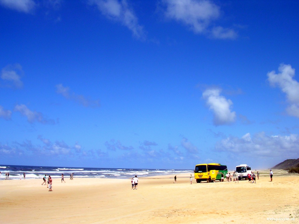 Ons eindpunt voor vandaag is Hervey bay. Vooral bekend vanwege de toegang tot Fraser eiland. Die avond een tripje voor morgen geboekt naar Fraser eiland. We gaan dus naar Fraser! Om acht uur 's ochtends worden we opgehaald door een grote bus die een rondje door Hervey bay rijdt en overal mede eiland gangers oppikt. Vervolgens met de veerboot over naar het eiland. Fraser eiland is een enorm zandeiland. Er zijn dus in het geheel geen rotsen te vinden en volgens zeggen is het het grootste zandeiland ter wereld. Er zijn ook geen verharde wegen en als we van de veerboot komen staat er een 4WD bus te wachten om de hele groep rond te rijden.