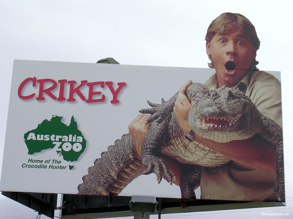 Doorgereden naar Nambour om te overnachten en Nambour ligt weer heel dicht bij onze bestemming voor morgen; de dierentuin van crikey "that is a genuine little fella" Steve Irwin. Vandaag dus naar de Australian Zoo "home of the crocodile hunter", want zo heet het officieel. Het is de tuin van de familie Irwin waarvan Steve sinds z'n optredens als dieren liefhebbende dorpsgek op tv toch wel de bekendste is. (zij die zich nu afvragen "wie is dat nu weer", kijk even een avondje Discovery channel en je komt hem geheid tegen). Een enorm reclamebord met Steve en een croq in aanvalshouding verwelkomt je. We waren Steve al vaker tegengekomen want hij maakt ook reclame voor Toyota en bij de reparatie van de auto, inderdaad bij een Toyota garage, stond hij ons vriendelijk toe te lachen.