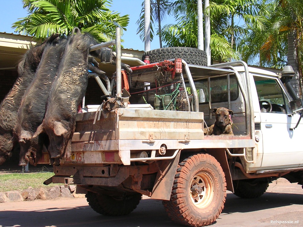 Onderweg nog een paar Dundee's met jachtbuit ontmoet. De everzwijnen hangen achter op de toyota en in de laadbak zitten drie enorme honden die vol met diepe snijwonden zitten. De zwijnen hebben zich kennelijk niet zomaar over gegeven...
