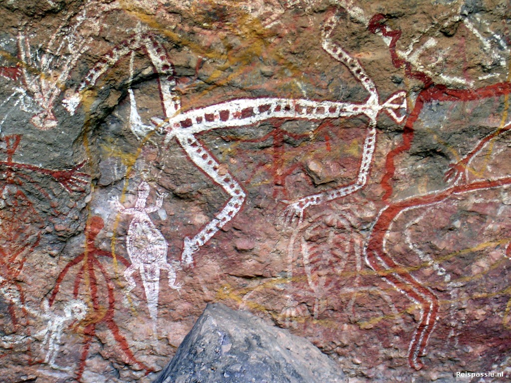 De volgende ochtend al heel vroeg een wandeling om een billabong (van de T-shirts...) gemaakt. Deze billabongs zijn meren die achterblijven na overstromingen door de rivier. Ze zitten vol met vogels. (en krokodillen schijnt het maar wij hebben ze niet gezien). Veel ijsvogeltjes gezien, en prachtige (hopen we dan maar) foto's gemaakt. Het is een prachtig stukje natuur. Daarna bij Nourlangie rotstekeningen van aboriginals bekeken. Sommige schijnen al meer dan 20000 jaar oud te zijn. Het zijn heel simplistische tekeningen. Laat een kind van drie op een rots tekenen en je kan het hier verkopen als aboriginal art. Beetje extreem natuurlijk, ze zijn dan wel eenvoudig maar vertellen wel een hoop over de (vroegere) aboriginal cultuur. Prachtige tekeningen over de aboriginal anticonceptie die nogal extreem is, maar dit is wat je noemt zo'n mooi verjaardag-met-een-biertje verhaal dus dat houden jullie te goed.