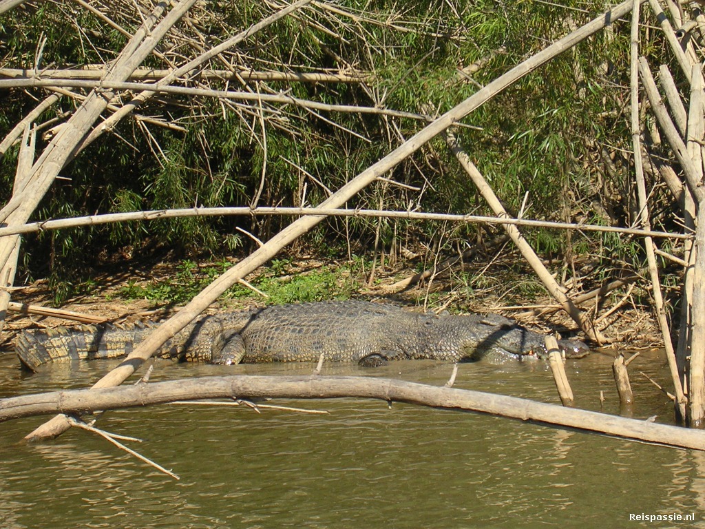 Vervolgens zijn we door Kakadu gereden naar het Mary river national park. Eigenlijk met het idee om alleen te overnachten maar de camping ligt direct aan de Mary river en dat geeft vismogelijkheden. Tenslotte moeten we nog steeds zo'n enorme barramundi aan de haak slaan. We hebben ons ook opgegeven voor een toertje wat de campingbaas met z'n bootje doet om krokodillen te bekijken morgenochtend. Dit is tenslotte de meest krokodilrijke rivier van Noordelijk Australie dus we zijn benieuwd. Maar eerst die middag gevist en dat is toch wat anders dan in de slotgracht. Je houdt vanzelf een veilige marge tot de waterlijn aan want de foto's in het campingkantoortje waren indrukwekkend genoeg, (daarom gaan we morgen ook mee met de trip!) Bij iedere rimpeling doe je vanzelf een stapje achteruit. Overigens geen krokodil gezien en ook nog eens niets gevangen. s 'Avonds pannekoeken bij het kampvuur gegeten, wijntje erbij, wallibi's die over het gras rennen, het is hier nog niet zo gek!