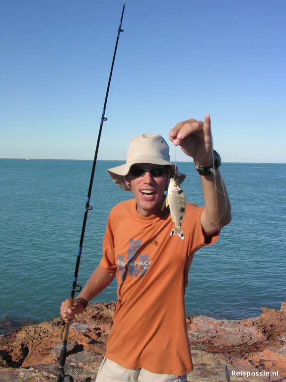 Er is ook een hele lange pier voor zeeschepen waar ze een voetgangersdeel naast hebben geplaatst. En vanaf hier is het goed vissen. Hoog boven het water terwijl achter je de vrachtwagens vol vee een schip beladen. We verschalken weer een mooi avondmaaltje. Bij de cablebeach de zonsondergang bekeken. Erg fraai met zeilbootjes en langs hobbelende kamelen.