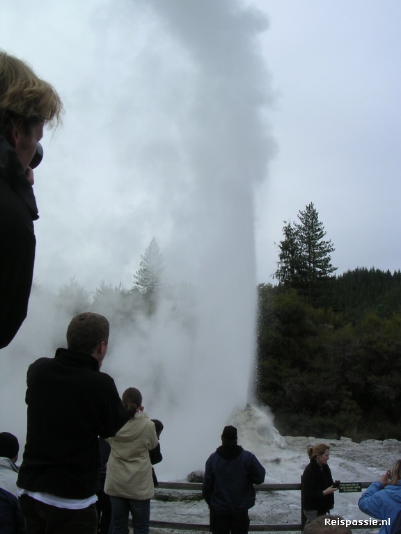 De dag er op 's ochtends vroeg eerst weer even een duik genomen. Daarna naar het dichtbij gelegen Wai-o-tapu. Ook dit is een thermisch gebied vol met geisers modderpoelen en bronnen in de meest prachtige kleuren. We bezoeken eerst de geiser. Deze wordt met de hand "opgestart". Door het toevoegen van een paar blokken zeep wordt de oppervlakte spanning van het koude water afgehaald waardoor het hete water uit het ondergelegen reservoir vrijkomt. Het reservoir bevat iets van 20000 liter wat dan onder hoge druk omhoog komt. En dus een mooi fonteintje als het boven de grond komt. We grappig om te zien dat voor dat de geiser losbreekt er eerst een enorme berg schuim uit tevoorschijn komt. Het schijnt dat ze deze geiser ook bij toeval ontdekt hebben toen er ooit een paar mensen in het hete water de was gingen doen. Die zullen zich aardig wezenloos geschrokken zijn!