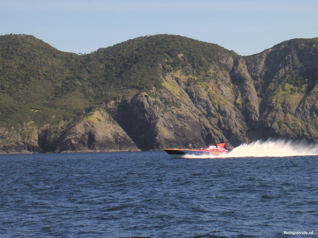 Uiteindelijk bij Russel uitgekomen. Een dorpje wat een van de eerste Europese nederzettingen was en ook de eerste "hoofdstad" van Nieuw Zeeland. Er staan dan ook heel wat oude gebouwen. Hiervandaan het pondje genomen naar de overkant; het plaatsje Paihia. Hiervandaan vertrekken allerlei boottripjes door de baai der eilanden. Omdat het nu zo fraai weer is besluiten we gelijk deze middag maar een tripje te nemen. Je hebt de keuze uit allerlei varianten met een gewone boot of een kortere trip met een powerboat. En aangezien dit het land van het adventure is gaan we natuurlijk met de powerboat. Het is een reusachtige speedboat met een soort vliegtuig cockpit er op waar de stuurman in zit. Je krijgt een speciaal pak aan tegen wind en water en snoert jezelf vast in de stoel met een gordel. En dan gaan!
