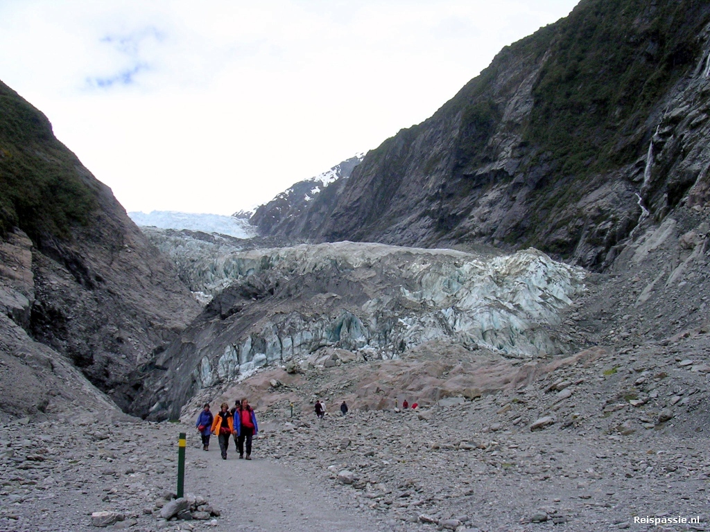 De volgende dag vervolgen onze weg naar de gletsjers. We gaan eerst naar de Fox gletsjes. De gletsjers zijn hier nogal speciaal t.o.v. andere in de wereld omdat ze gewoon tot in het regenwoud lopen. En ze zijn ook heel toegankelijk. We lopen tot de voet van de gletsjer. Er zitten nog wat stukken mooi blauw ijs tussen maar het meeste is al grauw van gruis en stenen. Daarna naar de Franz Josef gletsjer een half uurtje rijden verderop. Hier is het wat langer lopen naar de voet. Je kan wel tot op het ijs komen. Er lopen in de verte groepen met gids tussen de schotsen. Deze gletsjer is wel mooier dan de Fox. Meer helder ijs en je kan tot ver op de berg de gletsjer volgen waar hij bij de Fox al vrij snel de hoek om gaat. Hier een tijdje doorgebracht.