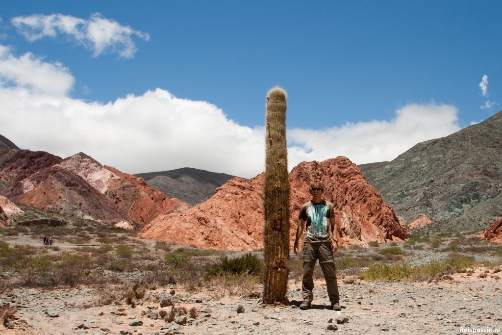 Vanuit het dorpje een pad de bergen in genomen. Als we de eerste heuvel over zijn ligt er nog een prachtig gekleurd gebied achter. Spectaculair om te zien, met af en toe een enorme cactus. We wandelen een paar uurtjes door dit fraaie gebied. Het is vandaag weer erg zonnig en de hoogte en harde wind maken dat je snel verbrand. Smeren dus!