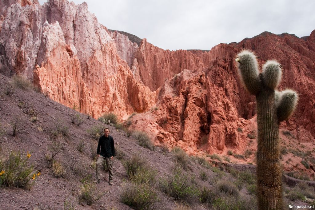 Een dag later een bus gepakt naar Uquia, een gehucht op tien minuten rijden van Humahuaca. Hier een lange wandeling gemaakt door een kloof achter het dorpje. We volgen de rivierbedding omhoog de kloof in. Het is een gortdroge omgeving. Gelukkig is het vandaag bewolkt zodat het met de temperatuur wel meevalt. Ondanks dat het zo'n droge omgeving is groeit en bloeit er toch van alles. Het meeste klein en met enorme stekels. De enorme cactussen staan er ook weer. Vaak hele groepen bij elkaar.