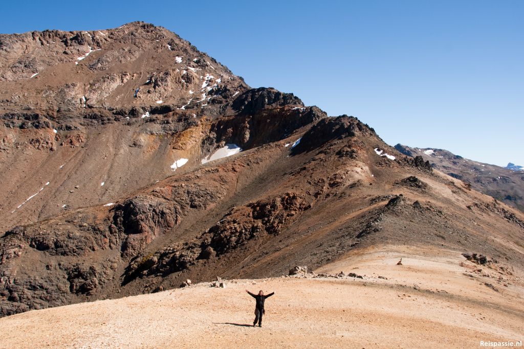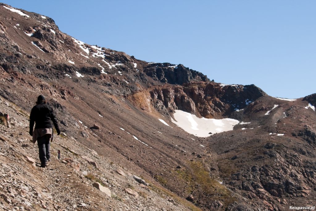 In een klein dal vlak onder de top gelunched. Prachtige plek met wat gras en een beekje met smeltwater. Geen wind, heerlijk zonnen!