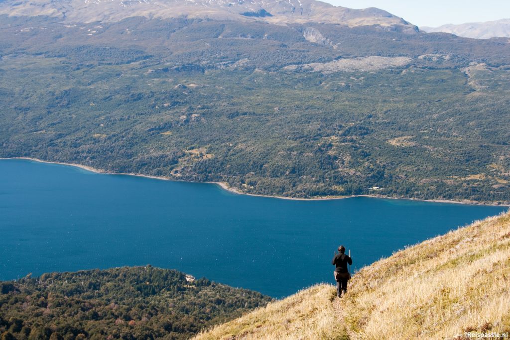 De bossen waar we eerst door lopen hebben een onder begroeiing van bamboe. Niet een beetje, echt enorme bossen van een meter of vier hoog. Gevolg is dat je voor uren niets anders ziet dan bamboe. Een beetje alsof je in een doolhof loopt. Even is het leuk en interessant, maar al vrij snel ging het irriteren om ergens te lopen waar je niets anders ziet als bamboe. Zodra we zo hoog zitten dat de boomgrens nadert is ook de bamboe verdwenen. Nu wordt het weer een fraaie wandeling. We lopen over de bergrug richting de top en de uitzichten zijn fantastisch. Het is werkelijk prachtig weer, onze eerste strak-blauwe dag in Patagonië! Het mocht ook wel eens een keertje!