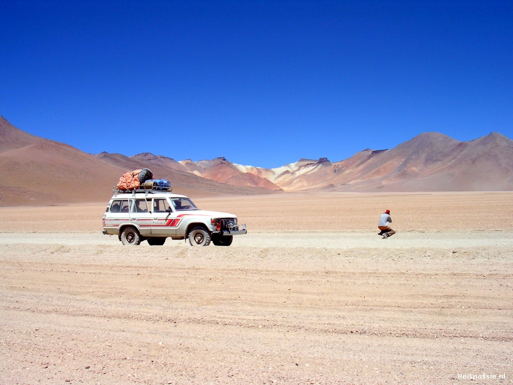 Nog altijd rijden we door wat een eindeloze woestijn lijkt. Maar hij is er weer niet minder mooi om. Vandaag moeten de meeste kilometers afgelegd worden en zullen we langer in de auto zitten. De eerste stop is bij het dal van een felgekleurde vulkaan waar de vicunas in de verte rennen. Dit roept altijd fotoaspiraties op, maar zodra je in de richting van deze gezellige huppelaars gaat nemen ze gelijk de benen. Veel foto's van Vicunakontjes dus...