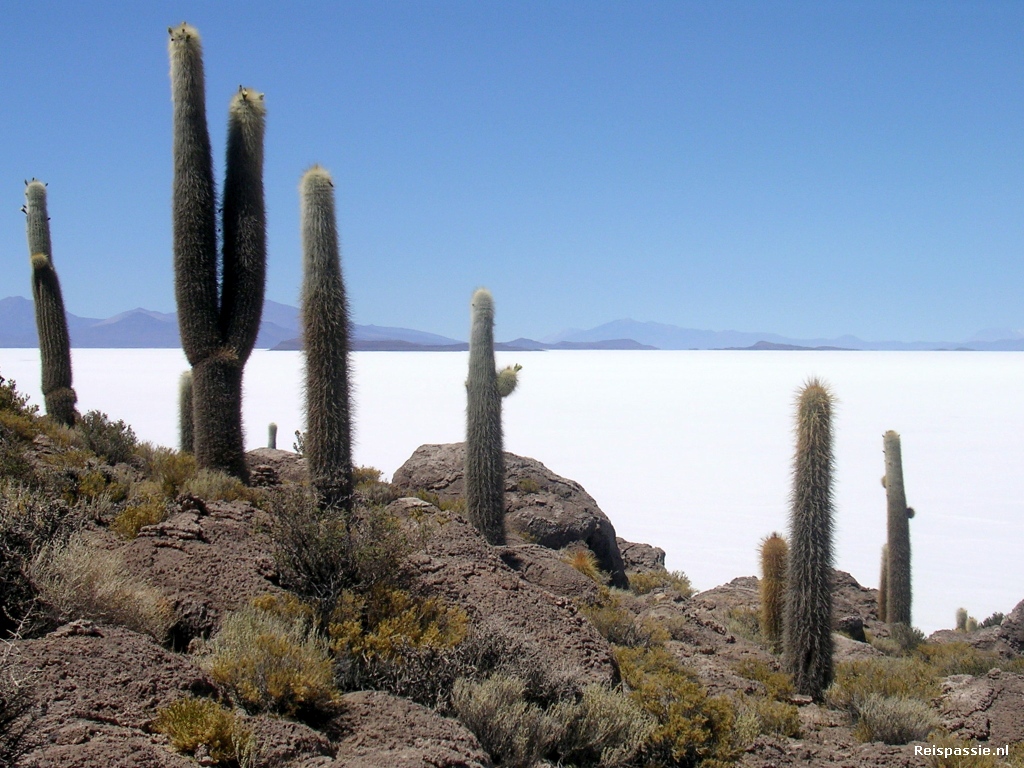 Het eiland is wonderschoon. De cactussen zijn enorm. Het schijnt de grootste soort ter wereld te zijn. De grootste hier zijn 12 meter en zo'n 1200 jaar oud. Ze hebben, naar verhouding, hele kleine bloemen. Wereldse fotoplek, cactussen met op de achtergrond het zoutmeer en een donkerblauwe hemel. Weer een rolletje vol.
