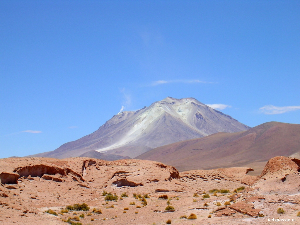 We zijn trouwens niet de enige die hier met een terreinauto op pad zijn. Af en toe is het net Parijs - Dakar als een stuk of wat auto's gevuld met backpackers over de zandvlaktes scheuren. Voor de lunch rijden we een heel eind over erg beroerde paden tot een uitzichtpunt op de Ollague vulkaan. Deze joekel van dik 6000 meter torent overal bovenuit. Het is een prachtige plek waar we eten. Een felrode rotsen verzameling die op een bizarre manier op elkaar ligt. En in de achterkant van de auto verschijnt weer een heerlijke lunch. We eten in elk geval prima bij deze trip.