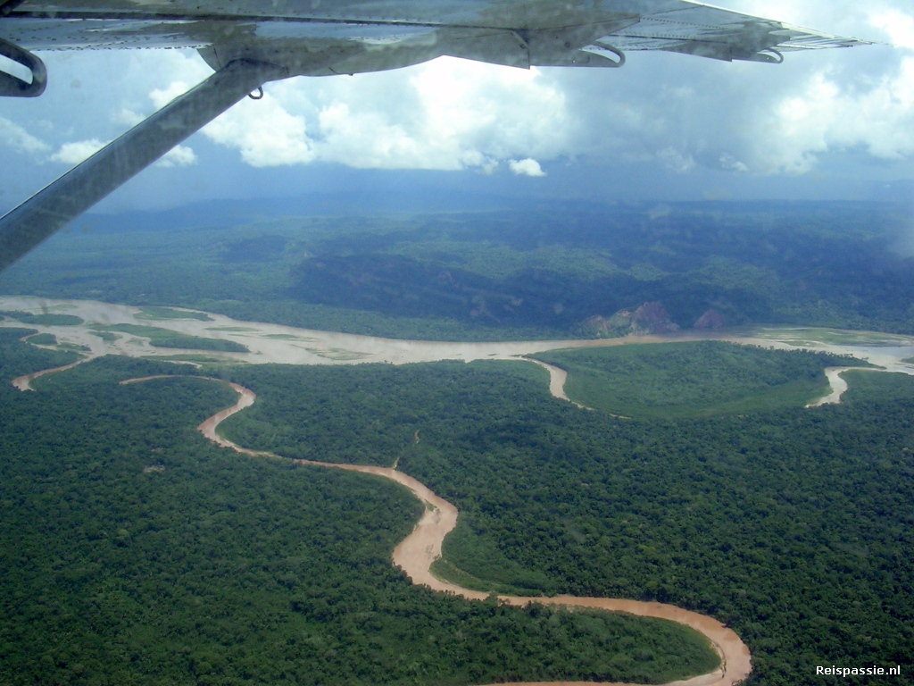 Als we eenmaal de hoge bergrug gepasseerd zijn veranderd het landschap kompleet. Het is een enorme grote groene zee van jungle onder ons. Bruine rivieren slingeren tussen de heuvels door. Dit is het begin van het Amazone gebied wat zich uitstrekt tot ver in Brazilie, Peru en Venezuela.