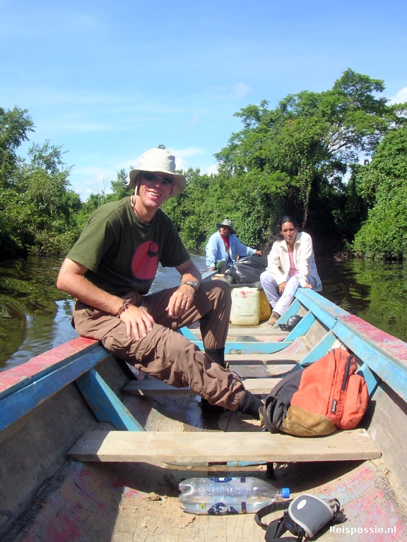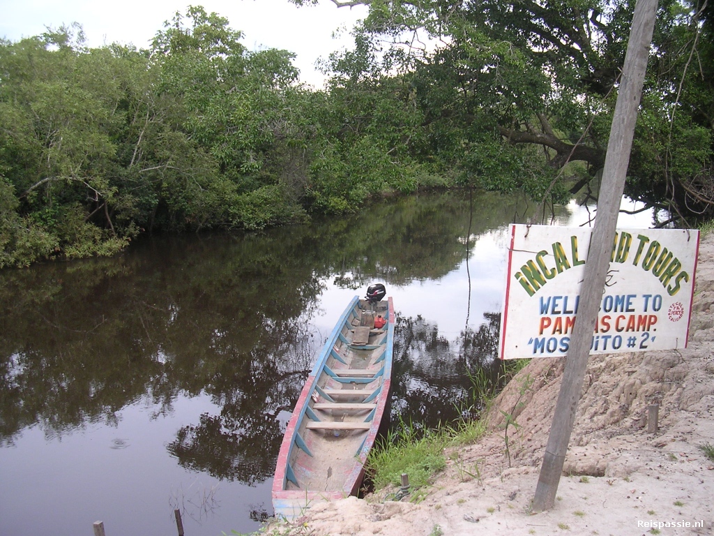 Het eerste uur zien we al tientallen schildpadden, alligators, zoetwaterdolfijnen, apen en heel veel vogels. In de bomen op de oever zitten veel grote nesten en de vogels zijn ook vooral groot. We zien pampas condors, enorme ooievaar achtige vogels met een reusachtige snavel en heel veel felgekleurde fazantachtige vogels met hanenkam die vooral in de bomen zitten die over het water hangen. Deze bomen maken de toch al vrij smalle rivier over hele stukken nog smaller maar het is prachtig om er tussen en onderdoor te varen. Om een uur of vier bereiken we het kamp wat de komende dagen onze basis is. Het is heel eenvoudig, een hut van afdekzeil met wandjes van muskietengaas. Hierin staan bedden met klamboe's. Verder een keukentje met houtstookfornuis en een eetruimte. Geen douche's, alleen een gat in de grond met toiletbril als wc. Onze kokkin gaat gelijk aan de slag en na een uurtje eten we heerlijk. Als het donker wordt gaan we weer de kano in om naar de alligators te kijken. Deze dobberen namelijk net onder de oppervlakte met alleen de ogen boven water. In in het licht van een zaklamp reflecteren de ogen als gloeiende rode kooltjes. We zien er een aantal en het is een heerlijk boottripje. Het is inmiddels afgekoeld en nu een aangename temperatuur en de muggen zijn vertrokken. De wolken zijn ook verdwenen en we varen onder de sterrenhemel die spiegelt in het donkere water van de rivier. Bij terugkomst in het kamp ons bedje gezocht.