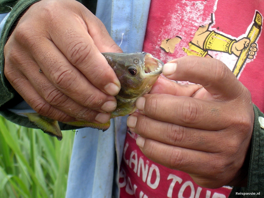 De landcruiser staat al klaar en we gaan de weg weer terug. Het is door de vele regen op sommige plekken een dikke laag blubber geworden en de auto zit van voor tot achter onder. Halverwege gestopt om op piranha's te vissen. Een stuk visdraad met haak en een stukje vlees er aan en dan maar afwachten. Er worden er verschillende gevangen. Het zijn eigenlijk maar kleine vissen maar wel met een bek vol scherpe tanden.