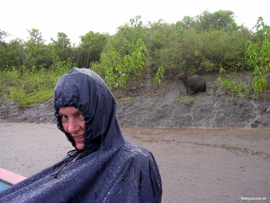 Dan weer de kano in. We zien weer heel wat dolfijnen. Het zijn niet van die springers zoals je soms op zee ziet en je moet goed kijken om ze te zien want ze komen maar heel even boven om lucht te halen. De vogels zijn ook weer volop aanwezig. Halverwege de middag begint het te regenen, net als we een heel eind van het kam zijn. Gelukkig hebben we wel onze poncho's bij ons zodat we droog zitten. Maar het gaat wel heel erg hard. Het regenseizoen laat weer even van zich horen. Het is een muur van water waar je doorheen vaart en de kano loopt gestaag vol zodat het vocht nu ook van onder komt. We gaan terug naar het kamp en zie onderweg onze eerste capibara, deze knaagdieren zijn de grootste ter wereld. Zeg maar een cavia van het formaat varken. Hij heeft overduidelijk geen last van de regen en banjert lekker door de blubber op de oever van de rivier.