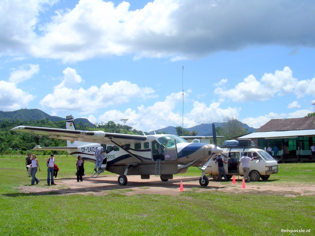 Zaterdagmorgen de taxi genomen naar het vliegveld van La Paz. Het ligt buiten het dal dus we moeten de hele weg weer omhoog. De chauffeur rijdt als een idioot en we zijn er dus ruim op tijd. Het is een kleine luchthaven met maar weinig vluchten, de meeste naar bestemmingen in Bolivia. Onze vlucht naar Rurrenabaque heeft vertraging en we vertrekken een uurtje later. Langs de taxibaan van het vliegveld is een kerkhof met oude vliegtuigen. Prachtige oude vervallen kisten op een rijtje. Nooit eerder gezien op een luchthaven.