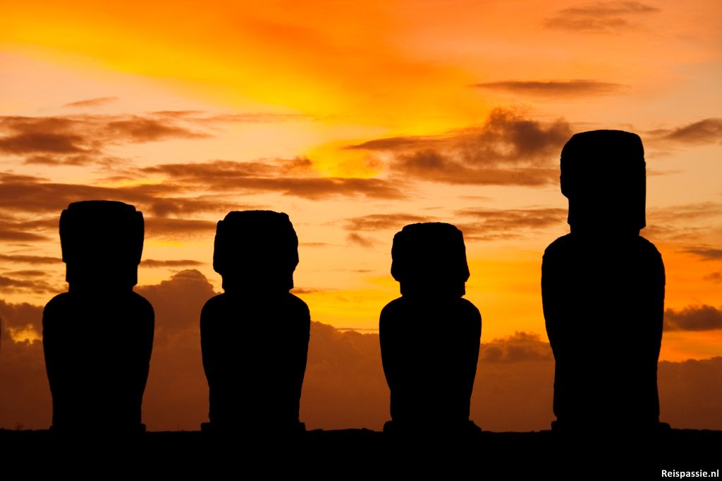 Helaas zit het weer niet echt mee. Afgelopen dagen was het stralend, vandaag is het grotendeels bewolkt. Tijdens onze lunch-stop op het enige zandstrand van het eiland begint het enorm te regenen. Het is maar een paar minuten maar we zijn kompleet doorweekt. Gelukkig blijft het verder wel droog dus de kleren zijn ook zo weer droog. 's Avonds de zonsondergang bekeken bij een groep moai even buiten het dorp en de volgende ochtend al weer vroeg op pad met het scheurijzer om de zonsopkomst te zien bij de grootste groep beelden heel aan de andere kant van het eiland. In beide gevallen een prachtig gezicht om de silhouetten van de moai tegen de gekleurde hemel te zien.