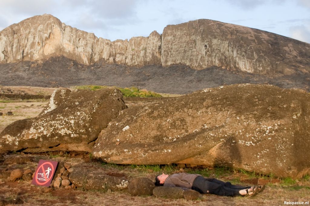 Maar met de telelens is alles dichtbij te halen... Deze plek is de groeve waar het merendeel van de beelden vervaardigt is. Een deel heeft nooit z'n bestemming bereikt of is nooit afgemaakt en staat nu als pionnen tegen de berghelling. In het gesteente is een enorme Moai van 22 meter te zien, deels al uitgehakt maar nog op z'n rug liggend in de berg.