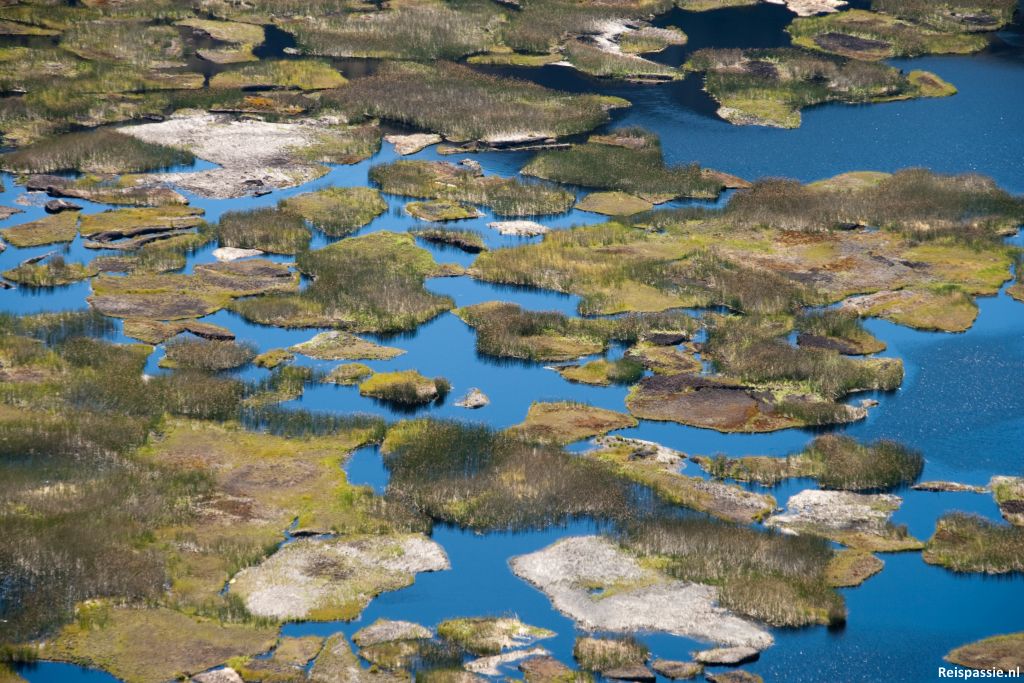 We lopen eerst onderlangs de landingsbaan en dan langzaam aan omhoog. Het is warm want de wind is weggevallen. Gelukkig zijn er nu en dan stukjes bos waar het lekker koel is. Bij de kraterrand gekomen steekt de wind weer op. Perfect temperatuurtje. Het is een prachtig uitzicht in de krater. Het meer in de krater is gevuld met honderden eilandjes met planten die als groene vlekken in het helderblauwe water drijven. Betoverend gezicht. Ook het uitzicht over de rest van het eiland is erg fraai. We kunnen net niet aan alle kanten de oceaan zien, een puistje is net te hoog..., maar het is een prachtig plaatje. Stukje verder gelopen langs de rand en dan weer naar beneden.