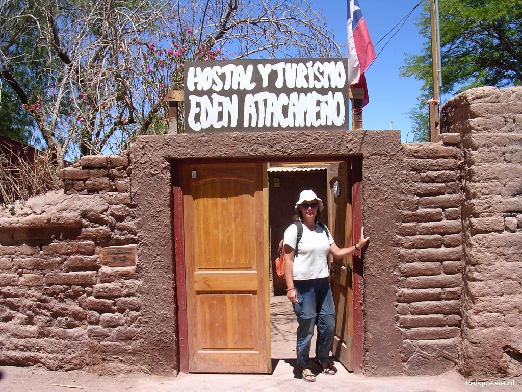 En opeens verschijnt er dan een kleine oase in de verte. Niet van beton zoals in Calama maar echt groen van bomen met aardekleurige huizen er tussen. Het is San Pedro. Een dorpje van niets maar voor het eerst zien we dat er dus toch nog wel meer mensen reizen door Chili. Heel wat westerlingen in de straten en dat terwijl we dagen geen andere reizigers zijn tegengekomen. Maar San Pedro trekt een hoop mensen vanwege de oase in de woestijn en het feit dat je hier heel wat trips in de omgeving kan maken. En, voor ons, ook de toegang tot Bolivia is. Een prachtig dorpje dus. We vinden een heel leuk hostal, kamertjes rond een binnenplaats met een grote boom en veel zitjes en hangmatten. Hier gaan we het wel een paar dagen uithouden! In de middag alvast wat bureautje's langsgegaan voor toertje's in de omgeving en een meerdaagse trip naar Bolivia. Mogelijkheden genoeg!