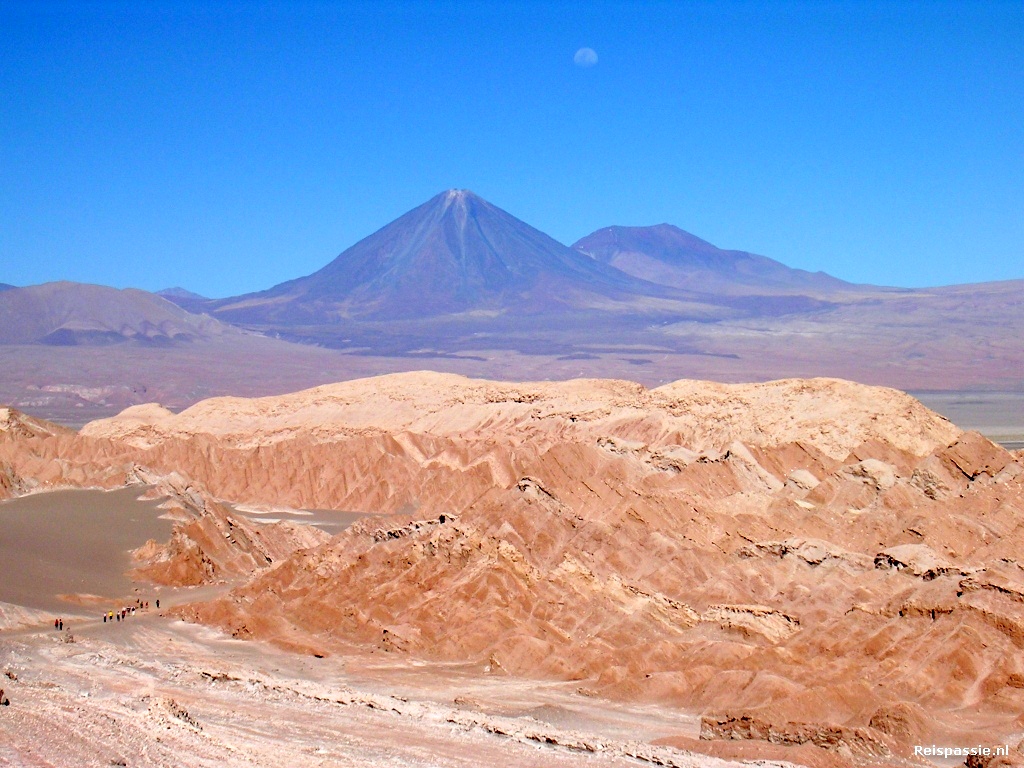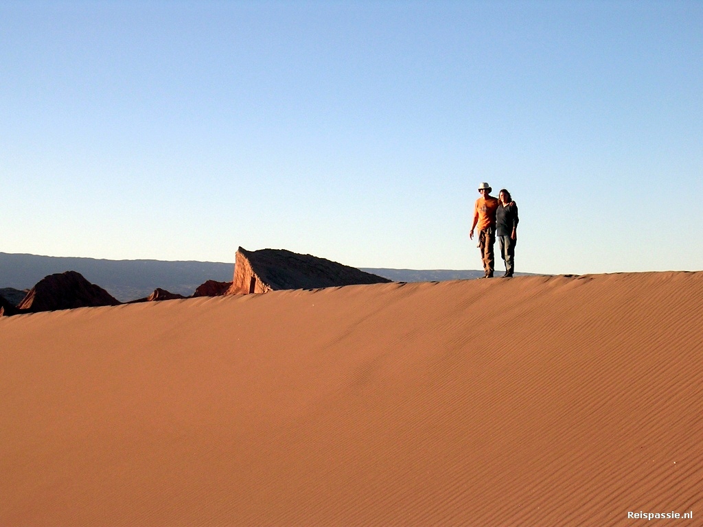 En we zijn niet de enige, tientallen busjes staan aan de voet van het duin en een grote hoeveelheid mensen is al aan het klimmen. Nooit gedacht dat er zoveel toeristen in San Pedro zaten. Een rustige romantische zonsondergang zit er dus niet in, maar hij zal er niet minder mooi om zijn. We klimmen eerst tegen het enorme duin op en wandelen vervolgens over de kam naar de rotsen aan de andere kant. Als we aan de overkant zijn zakt de zon op z'n laagste punt. De hele omgeving kleurt nu paars/roze en de grote vulkaan in de verte lijkt net een omgekeerde suikerspin. Prachtig om te zien.