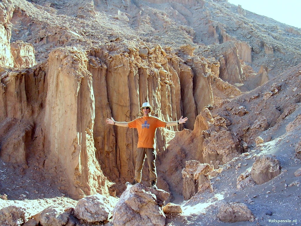 We maken aan het eind van de dag een trip naar de Valle de Luna. Met een busje door de woestijn. De rotsen die we al eerder uit de bus zagen zien er zo tegen zonsondergang nog veel mooier uit. De rotsen kleuren prachtig in alle tinten rood en geel. Verschillende wandelingen door kloven en over zandduinen gemaakt. Veel foto's geschoten. De trip eindigt bij een enorm zandduin waar we de zonsondergang gaan meemaken.