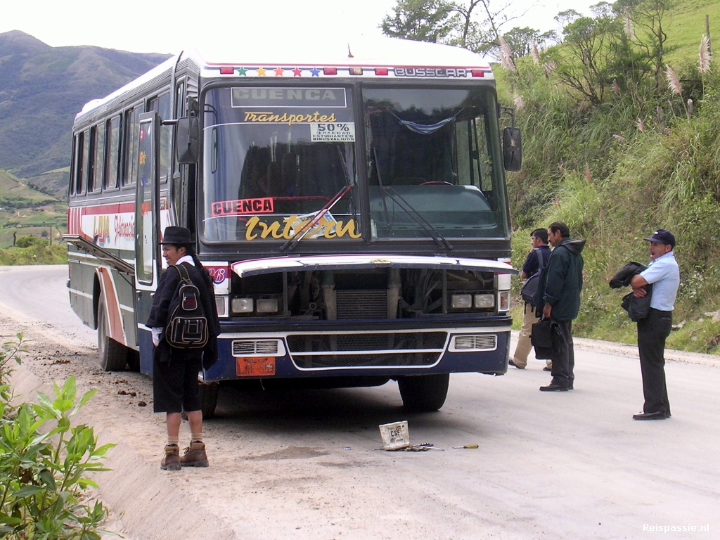 Na drie dagen van dit moois te hebben genoten weer op pad gegaan. De bus terug genomen naar Loja en van af hier gelijk door naar Cuenca. Halverwege Loja en Cuenca stopt de bus ermee. De chauffeur en z'n maatje doen nog verwoede pogingen om hem weer aan de praat te krijgen maar het bus-kaarsje is uit.