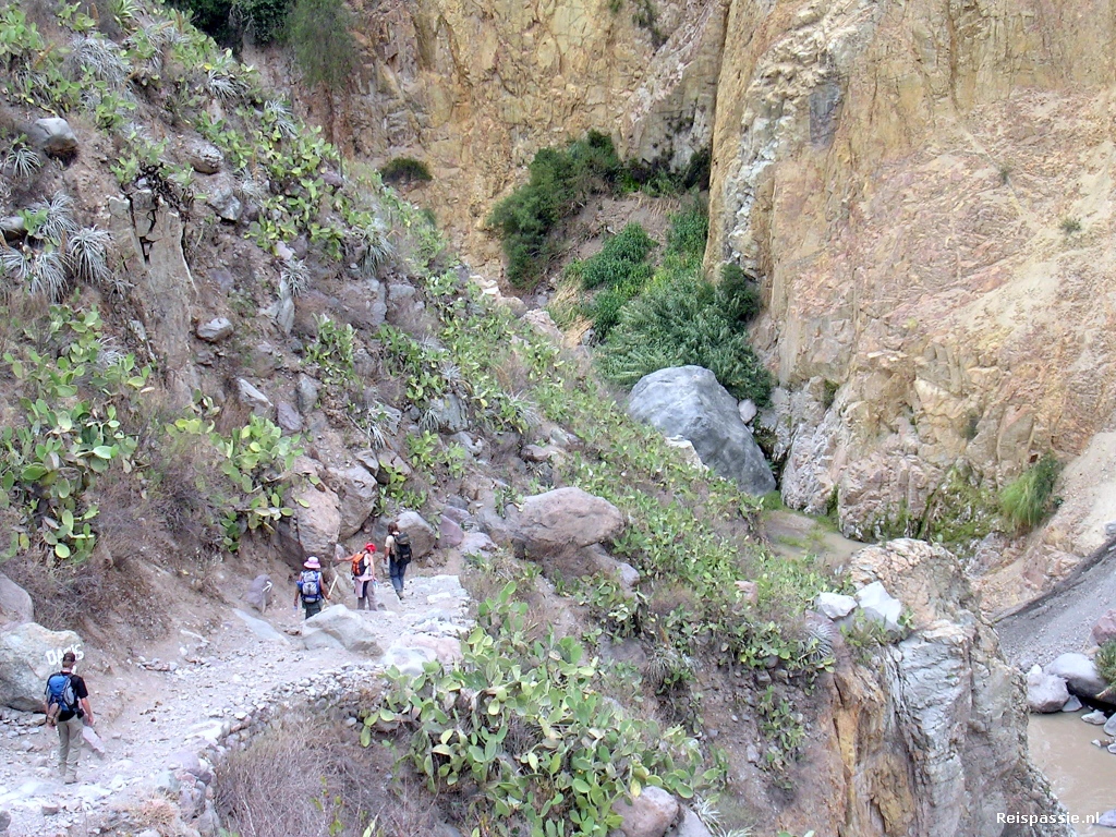 De volgende dag lopen we door de canyon. Af en toe omhoog, dan weer naar beneden. Niet echt zwaar dus want je blijft vrij dicht bij de rivier. Het is ook niet al te lang want rond de middag zijn we al bij de volgende overnachtingsplek; de oase!