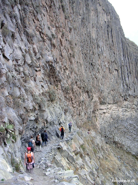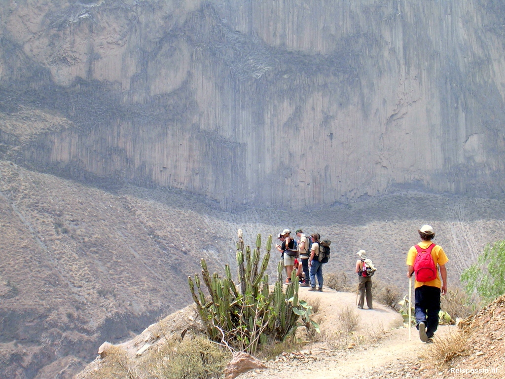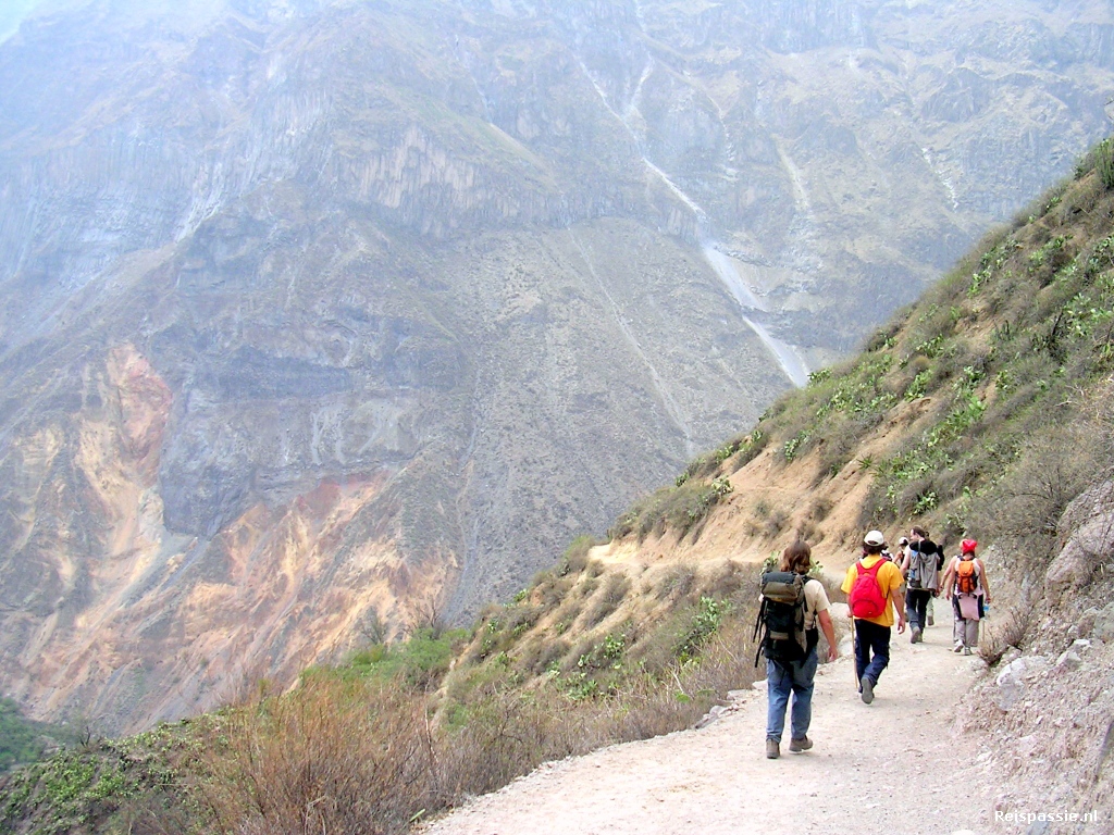 In Chivay vijf minuten sanitaire stop en dan weer dik twee uur onverhard en dus al stuiterend tot Cabanaconde. Hier rollen we lekker geklutst de bus uit en is het eerst maar eens tijd voor lunch. En dan eindelijk de canyon in, daar zijn we tenslotte voor gekomen. Het is (uiteraard) eerst afdalen. In totaal een uur of vier naar beneden. Deze canyon is een van de diepste ter wereld. Op het diepste punt 3191 meter. De allerdiepste ligt aan de andere kant van de bergrug, dit is de Cotahuasi die nog 163 meter dieper is. De afdaling gaat langs steile basaltwanden maar het pad is over het algemeen vrij eenvoudig begaanbaar. Af en toe zien we al condors vliegen hoog boven ons in de canyon. Als kleine stipjes tegen de grijze wolken.