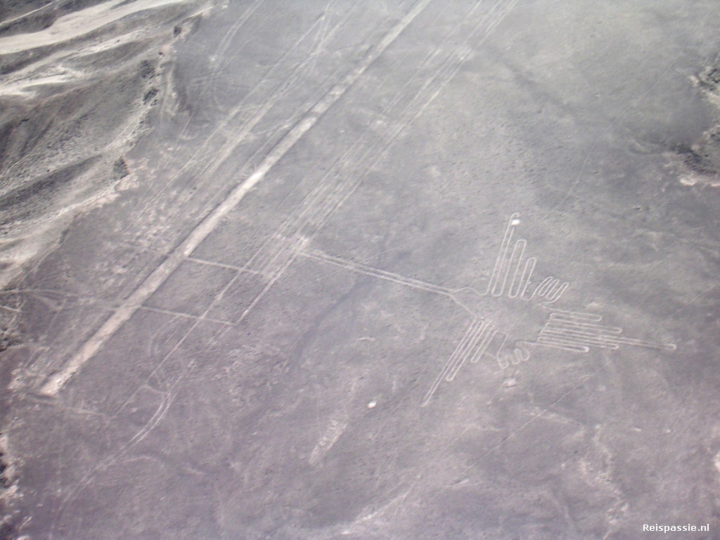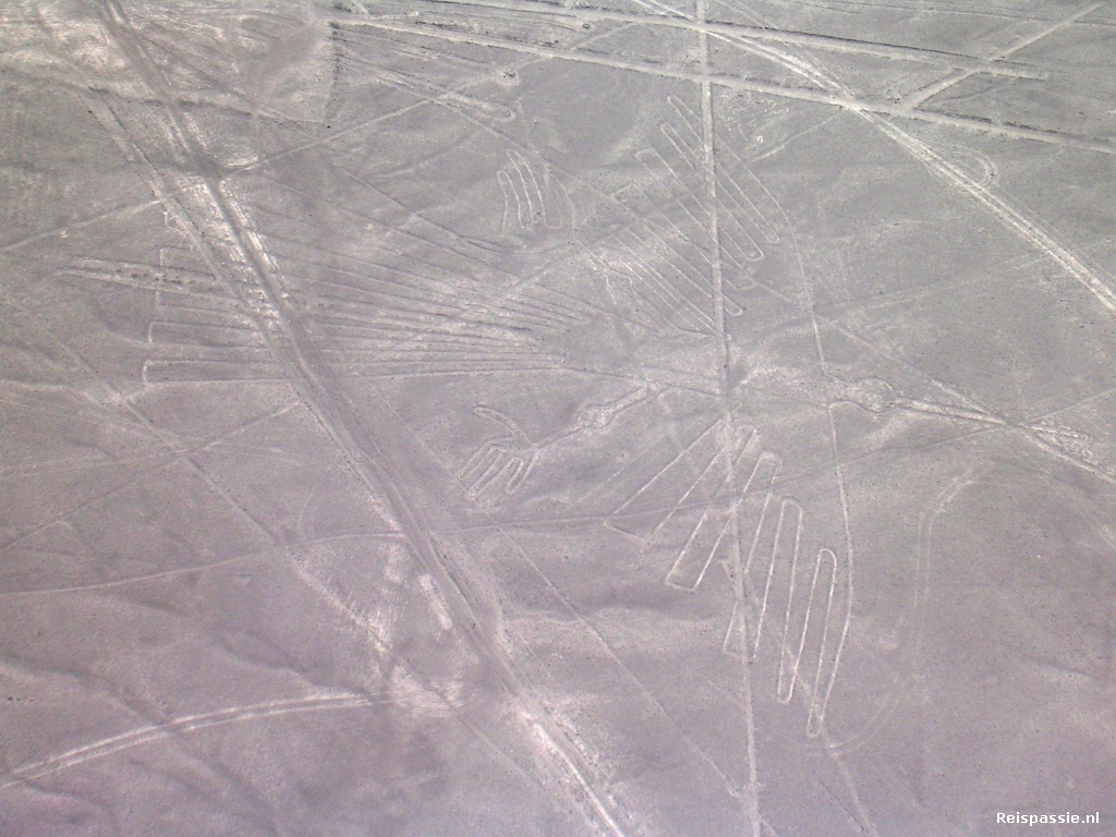 Dan is het wachten tot ons vliegtuigje klaar is. Het is een vier persoons vliegtuig, twee man voor en twee achter. Een Koreaanse jongen vliegt met ons mee. Al vrij snel na het opstijgen worden de lijnen zichtbaar. Het is een fascinerend gezicht. Vanaf de grond zie je niets en hier in de lucht word een enorm gebied zichtbaar vol met lijnen ogenschijnlijk kris-kras door elkaar. Nog steeds is het hoe en waarom onduidelijk. Er zijn allerlei wilde theorieen, tot het aanroepen van buitenaardse wezens aan toe. Maar eigenlijk is het onbekende wel mooi zo, het blijft nu een heel mysterieus geheel. Het is een hele prestatie dat ze al die jaren geleden in staat waren zulke kaarsrechte lijnen aan te brengen zonder het overzicht wat wij nu vanuit het vliegtuig hebben. En dan zijn er natuurlijk de figuren; de condor, aap, vogel en noem maar op. De piloot laat iedereen een zo mooi mogelijk plaatje zien en draait met scherpe bochten van links naar rechts om de figuren heen. Dit is waar het achtbaan gedeelte begint. Maar gelukkig duurt het niet al te lang, na een half uurtje staan we alweer op de grond. Dat waren de Nasca lijnen dan al weer...