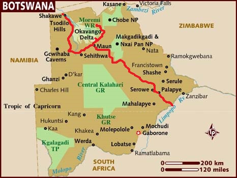 Vandaag een klein stukje rijden, we gaan neer het Rhino Sanctuary iets voorbij Serowe.