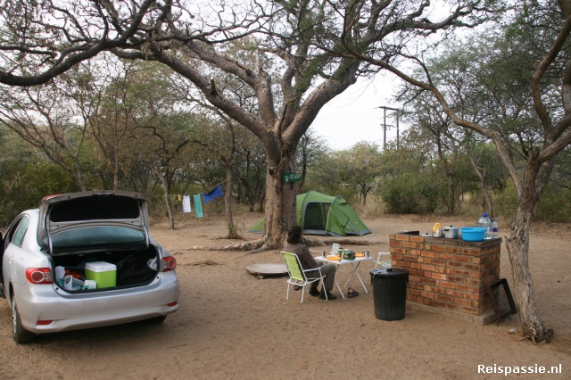 Na een uurtje of twee bij park wat zich op de bescherming van neushoorns richt. En niet alleen neushoorns want er zit hier als het goed is allerlei wild. Bij de receptie een kampeerplaats in het park geregeld en geïnformeerd voor een tourtje. Helaas is die voor vanmiddag al vol. Morgenochtend kan nog wel. We denken er nog even over. Eerst eens ons tentje opzetten. De campsite ligt een kilometer of twee het park in en de zandweg er naar toe blijkt een mooie uitdaging voor onze glimmende bolide. Hij wordt vooral bereden door hoog op de wielen staande 4wd's en daardoor ligt er tussen het spoor een hoge zandheuvel. Een uitdaging.... Maar we zijn er doorheen geploegd. Missie geslaagd. Prachtige campsite midden in de bush. Het bulkt er van de vogels. Anita spreekt een stel Zuid Afrikanen en die bieden ons aan om die middag met hen mee te gaan op een “gamedrive” door het park. Zij verplaatsen zich met een dikke Landcruiser dus dat is gewoon geweldig! Kunnen we toch vandaag nog op pad.
