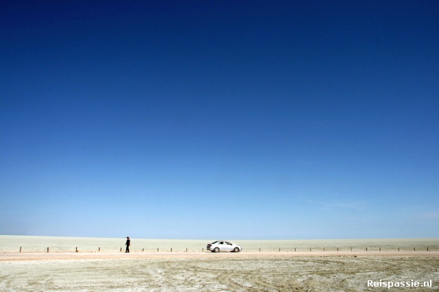 Het is 70 kilometer rijden naar de volgende campsite, Halili. Onderweg stoppen we nog even bij het uitzichtpunt over de Etosha zoutpan. Eindeloos verkijken in het oneindige niets. Wat een vlakte.