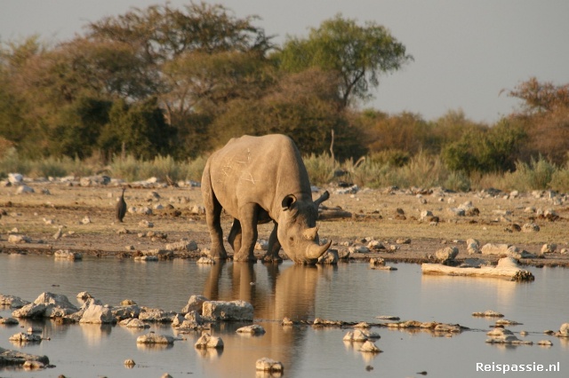 Rond de middag weer ons tentje opgezet, eitje gebakken, douche gepakt en lekker niks gedaan totdat het weer tijd is om een rondje te maken. We blijven in de buurt en sluiten af met het waterhole bij de campsite. Hier is op de rotsen een afdakje gemaakt met bankjes er onder. Kan je heel ontspannen naar de beestjes kijken zonder dat er auto's aankomen of wegrijden. Ook hier een neushoorn bij de waterplek. 's avonds bij het eten komt er nog een Honey Badger langs om de vuilnisbak te plunderen. Ziet er uit als een grote das en schijnt geen angst te kennen. En doet kennelijk z'n dagelijkse rondje langs de vuilnisbakken want je hoort overal om je heen in het donker de bakken om donderen.