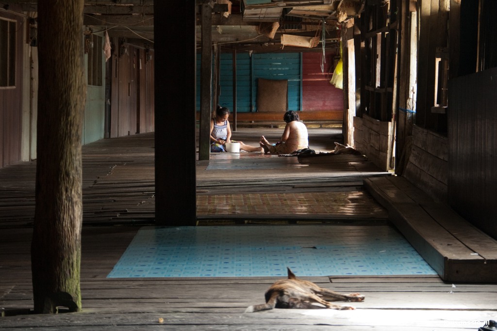 Dan een rondje over de veranda en buitenom gemaakt. Het is er opmerkelijk stil. Iedereen is naar het werk of naar school. Alleen wat vrouwen en kleine kinderen scharrelen rond net als de honden en kippen een paar meter lager in het donker onder de planken. Maar de veranda is vooral erg leeg. Niets geen oogst wat ligt te drogen of andere activiteiten. Wel een verschil met eerdere longhouses die we hebben bezocht. Daar was de veranda een brei van activiteiten en waren er diverse kookplaatsen waar de vuurtjes rookten. Hier heeft elk huisje z'n eigen keukentje op gas. Het leven speelt zich hier overdag in de stad af en men komt 's avonds bijeen.