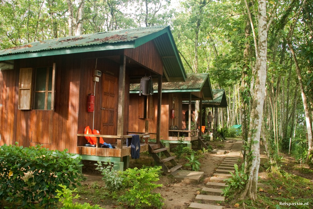 We gaan met een bootje naar de overzijde waar de “Nature lodge” zich bevindt. Slogan van deze toko: It's a jungle out there! Even een inleidend praatje, de tassen in onze cabin gelegd en dan met een bootje de rivier op. Het is momenteel hoogseizoen in Maleise en dat is goed te merken. Maar liefst vijf bootjes varen uit, alleen al van onze lodge. Er zullen zich er nog heel wat bijvoegen op de rivier.
