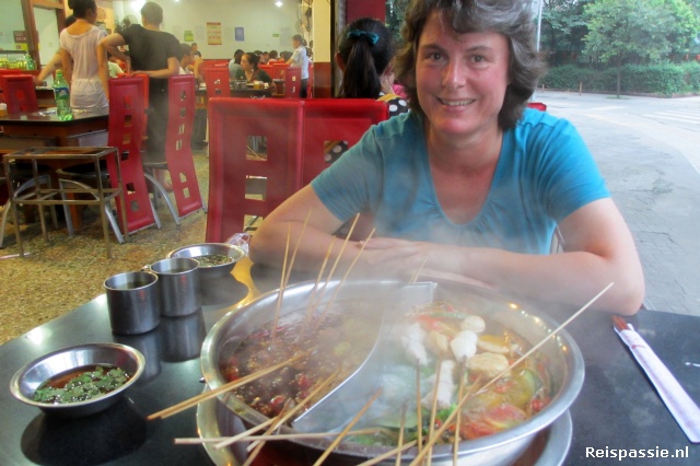 We verblijven een aantal dagen in Chengdu in het Trafic Inn hostel. Mooie centrale plek aan de rivier. De eerste dag door het centrum gewandeld. Wat meten opvalt zijn de vele elektrische scooters. In het centrum mogen geen brommers of scooters met brandstofmotor komen en iedereen rijdt nu dus elektrisch. Duizenden scootertjes. Van model vouwfiets tot superluxe. Als zo'n meute bij het stoplicht in beweging komt is het elke keer weer verrassend dat dat onder enig geluid (en rookwolken) gebeurd.