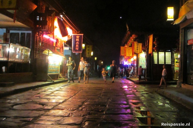 De oude straatjes van Langzhong glimmen in het avondlicht door de vele regen van vandaag. Uren heeft het geregend maar gelukkig is het nu weer droog. We wandelen langs scheefgezakte houten huisjes met de kenmerkende grijze pannen op het dak. Langzhong is zo'n stadje met een oud historisch centrum. Gelukkig is dit nog een “levend” oud stadje.