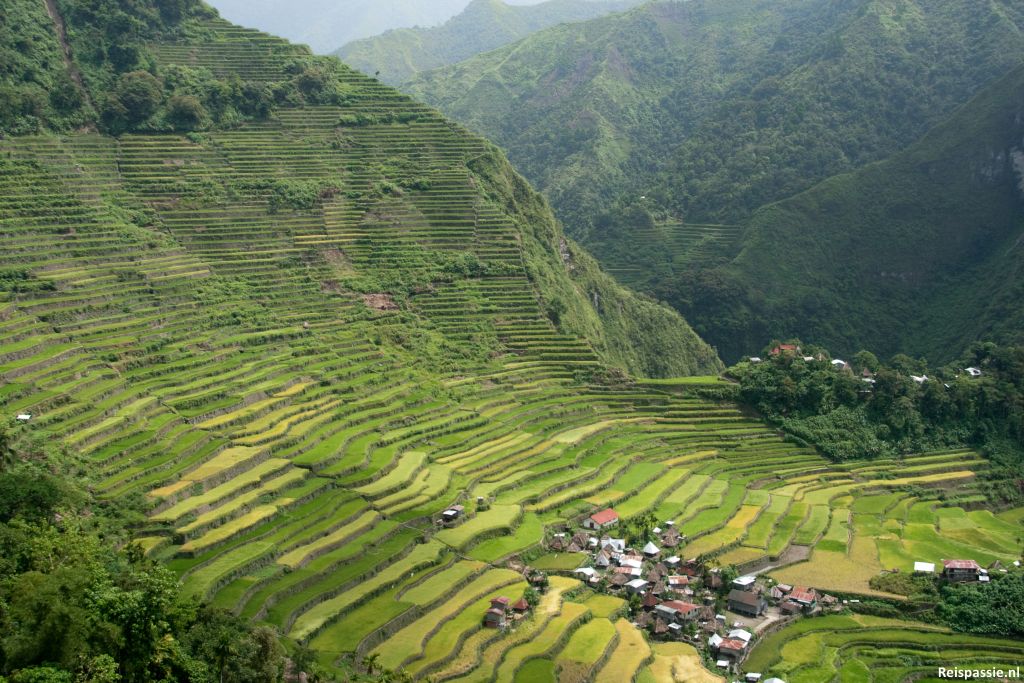 Vanaf hier is het lopen richting Batad. Een anderhalf uur door de bergen, eerst omhoog en dan het dal in richting de rijstvelden. In het dorpje aangekomen zijn de uitzichten prachtig. Vandaag is het zonnig en de veldjes kleuren van groen tot geel. Hier een uurtje bij een restaurantje op de veranda gezeten en genoten van het uitzicht en de lokale pizza. Schitterende plek, de rijstterrassen hier zijn al tweeduizend jaar oud, niet voor niets op de Unesco werelderfgoederen lijst.