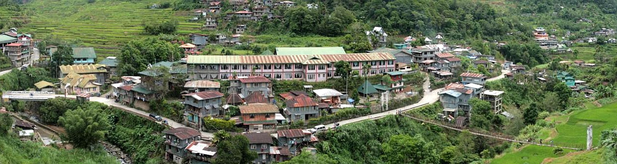 Banaue ligt zelf tussen de rijstterrassen en is de toegangspoort tot die van Batad. Het is maar een uurtje of twee bussen dus we zijn lekker vroeg in Banaue. Het dorpje ligt in een steil dal en wordt doorsneden door een rivier. Vrijwel alle huizen zijn tegen de steile hellingen opgebouwd. Ons hotel idem dito en het is vanaf straatniveau wel vier verdiepingen naar beneden en drie omhoog. Een enorm hoog gebouw ingeklemd tussen een helling vol van dit soort bouwsels. Prachtig uitzicht vanuit het restaurant over de rest van het dorp en de rijstvelden.