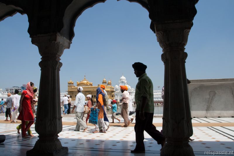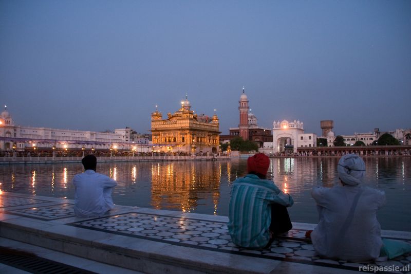 Bij de tempel is het een drukte vanjewelste. Onze sandalen geven we af bij en loket aangezien je natuurlijk alleen blootsvoets naar binnen mag. Het is een mega schoenenstalling met honderden schoenen! Voor de ingang staat een mand met hoofddoeken die binnen verplicht gedragen moeten worden. Een leuk kleurtje uitgezocht en dan langs de wachten met speren door de poort naar binnen. De gouden tempel staat midden in een meer wat omgeven is door een breed marmeren plateau met galerijen aan de buitenkant. Iedereen loopt linksom een rondje om het meertje met de tempel en we sluiten dus ook maar aan. Er wordt gebeden en op sommige plekken gebaad in het meer. De tempel zelf staat te letterlijk te schitteren in het water bij de ondergaande zon. Het is een prachtige gouden tempel met veel minaretten. Een overdekt voetpad ligt door het water naar de tempel en staat de hele dag vol met rijen met pelgrims die het heiligdom van binnen willen aanschouwen.